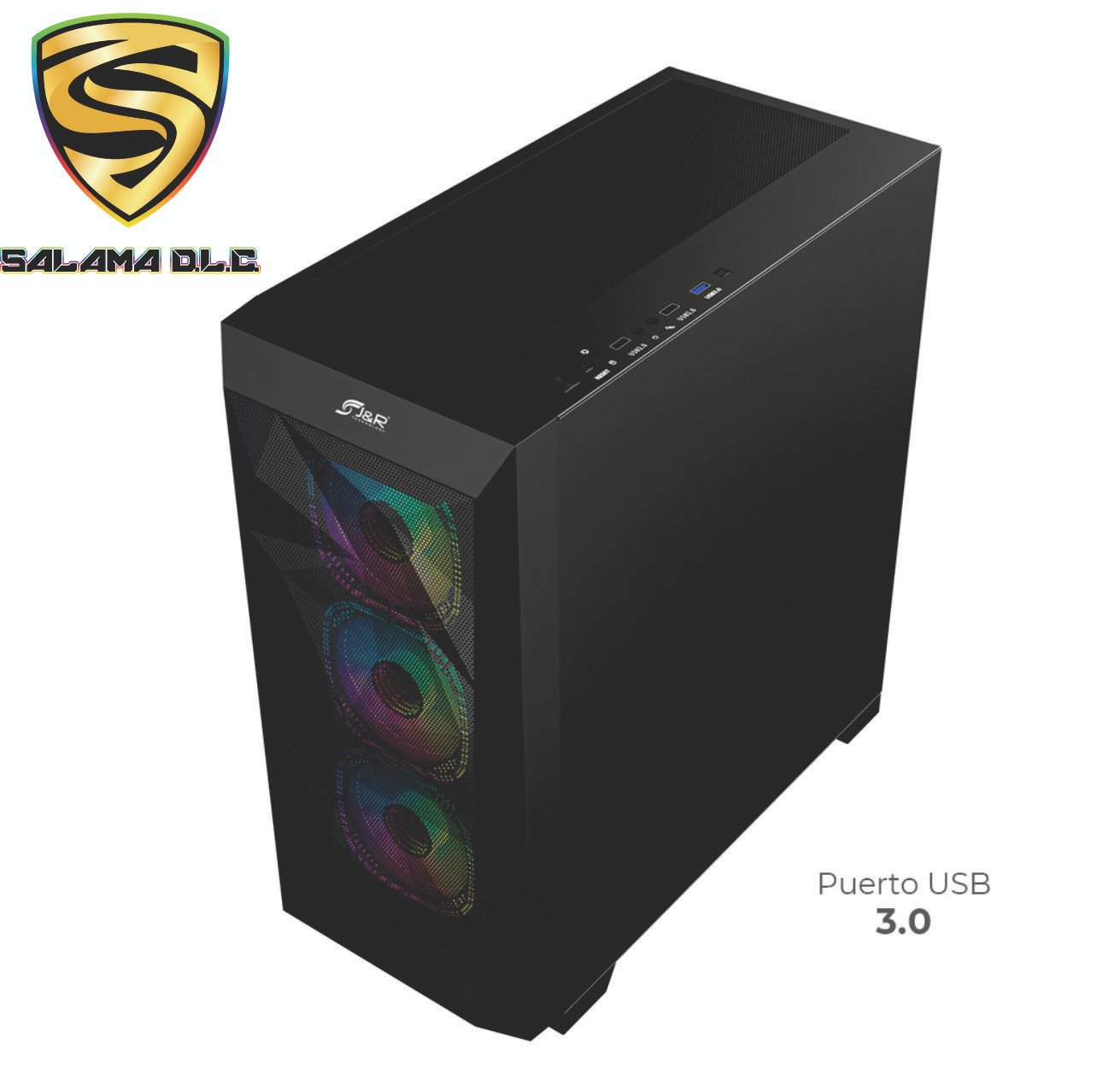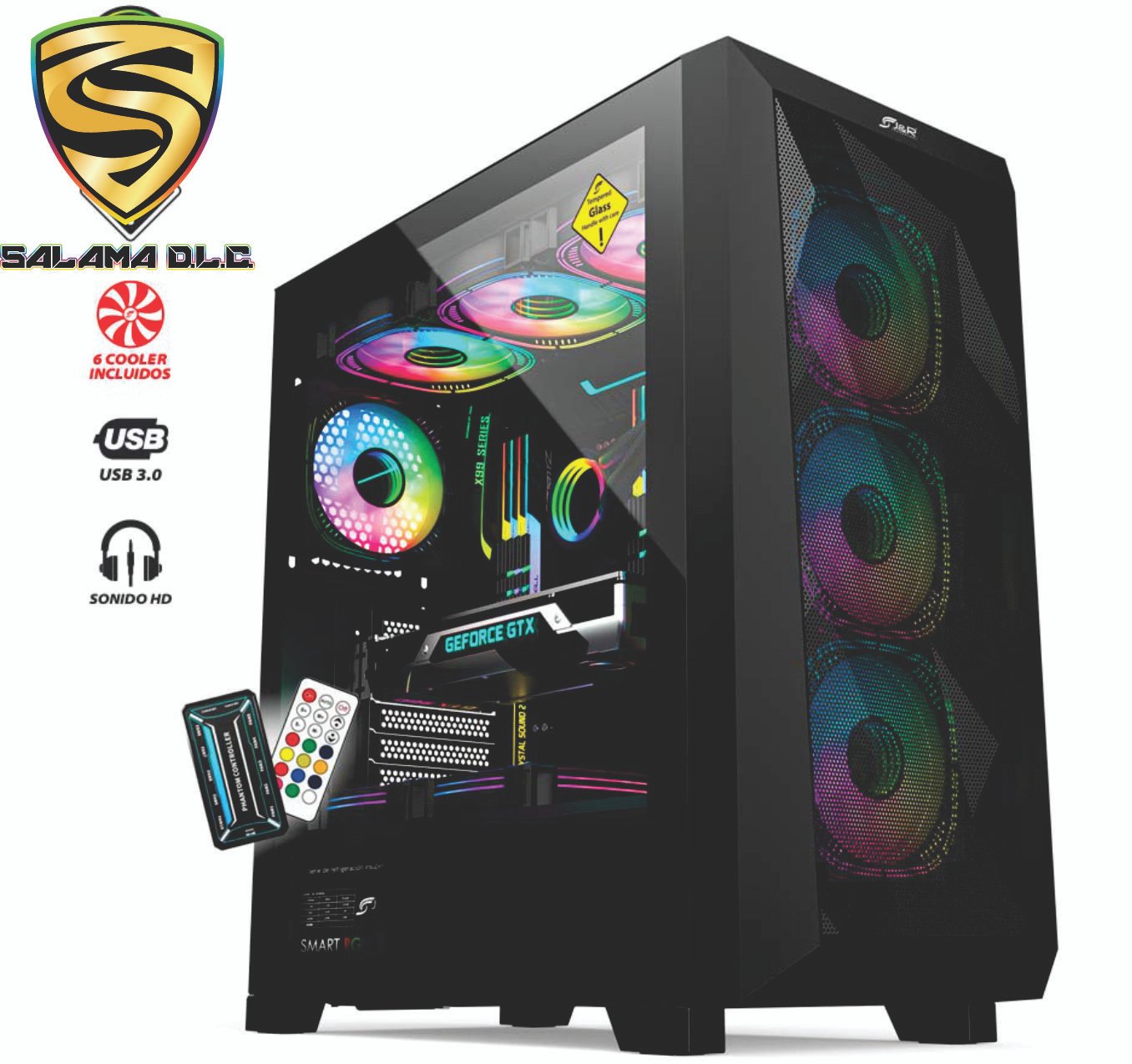 incluye 6 cooler con tecnología ARGB instalados, controladora y control remoto para ajustar la velocidad, intensidad, color o efecto de iluminación de los cooler (+ 100 modos de luz)